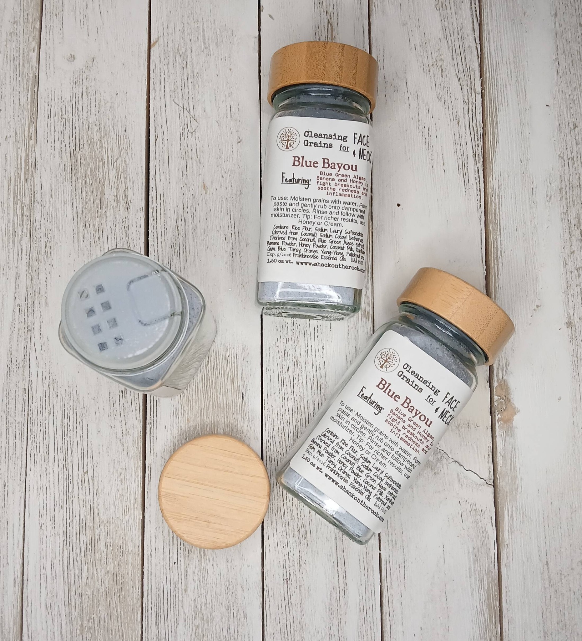 To use: Remove Bamboo lid, use the Sifter to either pour or sprinkle approx. 1 to 2 tsp. of grains into the palm of your hand, moisten with liquid of your choice. Form a paste and gently rub onto dampened skin in circles. Rinse and Pat or wipe dry with wet cloth. Follow with moisturizer.